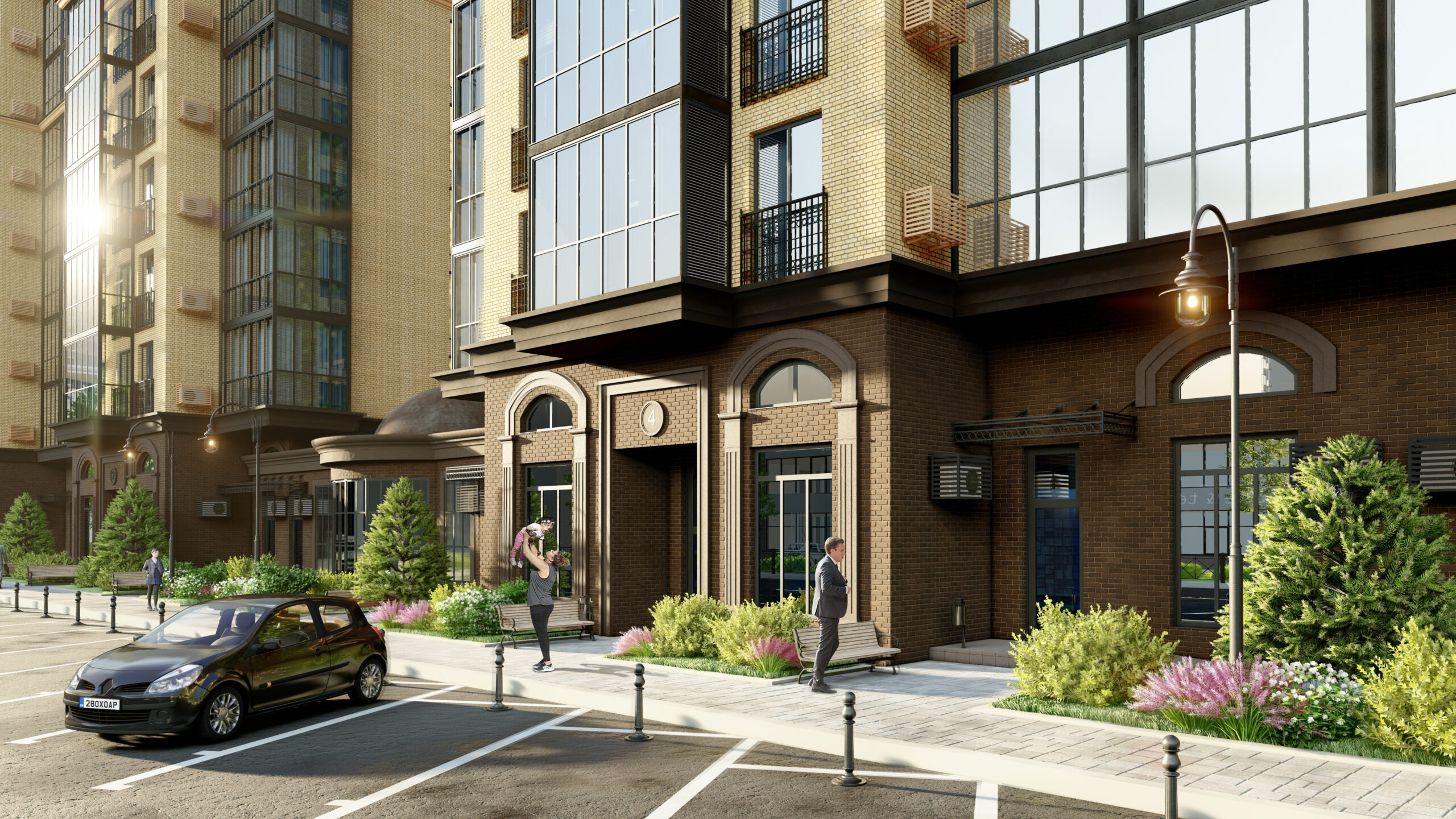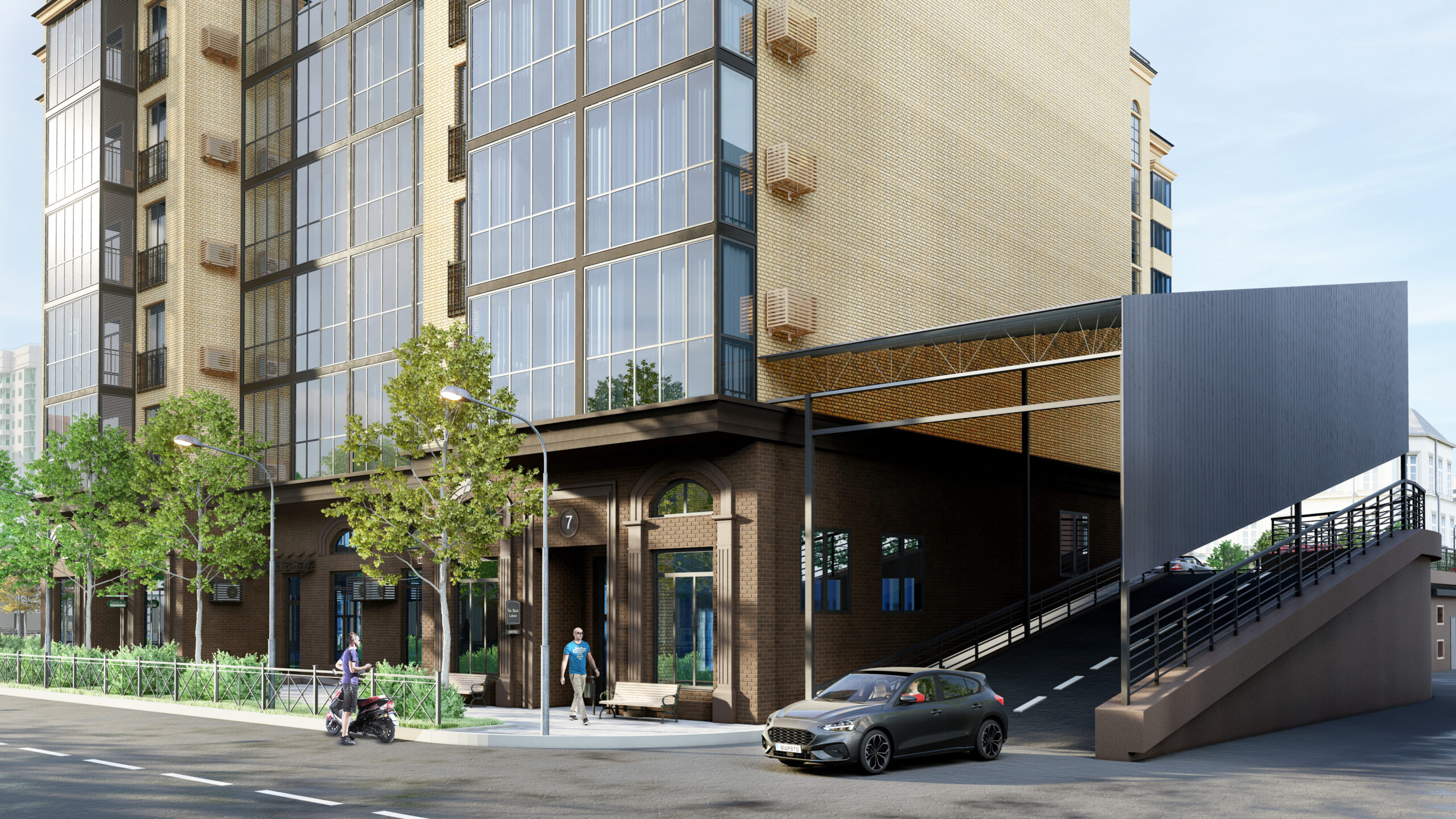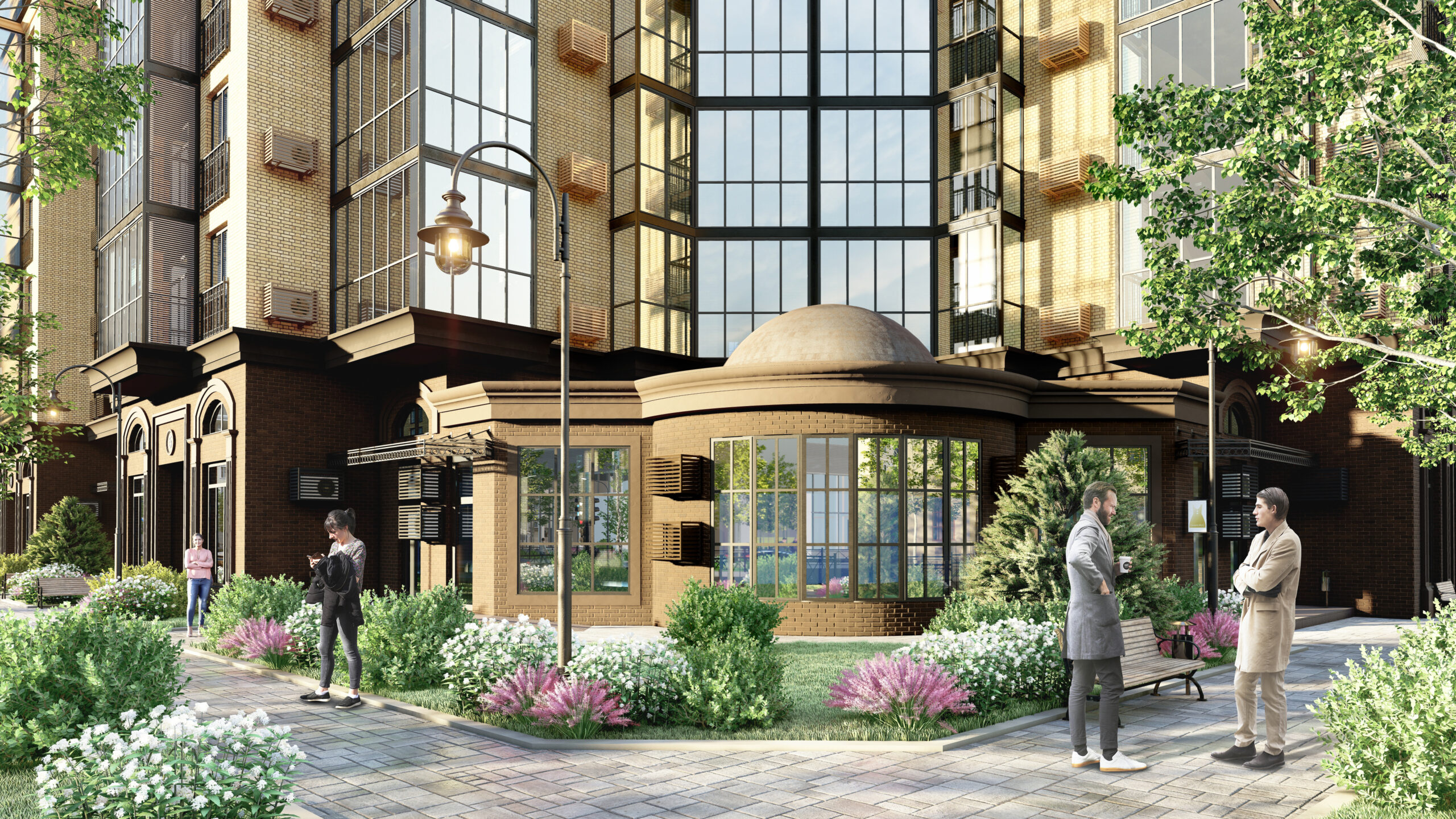 Так появился проект с характерными и, в будущем, фирменными деталями - 25 этажей с арочными завершениями оконных и дверных проемов с комбинированным фасадом в двух вариациях: декоративная штукатурка и вентилируемый фасад в гармоничных темных и пастельных тонах.